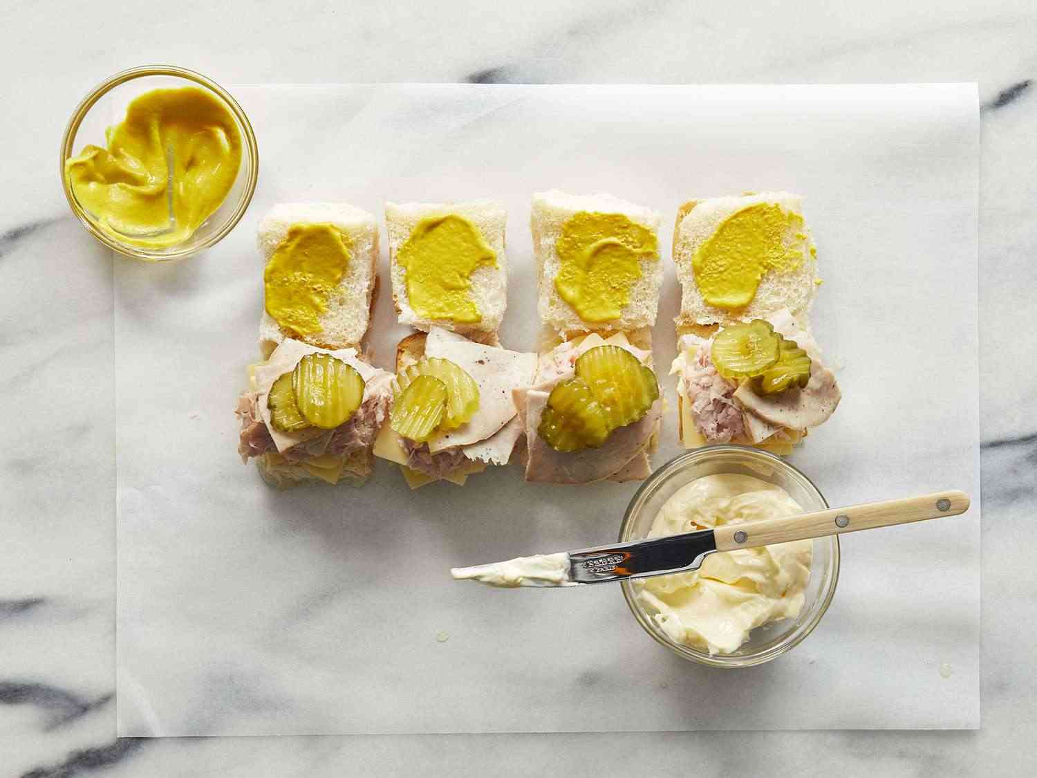 - Step 1:Split the sandwich rolls in half, and spread mustard and mayonnaise liberally onto the cut sides. Dotdash Meredith Food Studios